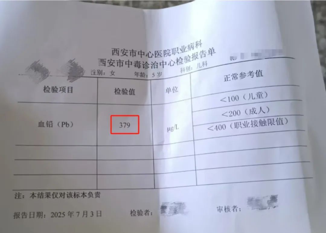 事发后,该幼儿园不少家长带孩子前往临近省份的西安中心医院检查治疗。一名5岁女童在该院的检查结果显示,其血铅检验值为379微克/升,即中度铅中毒。